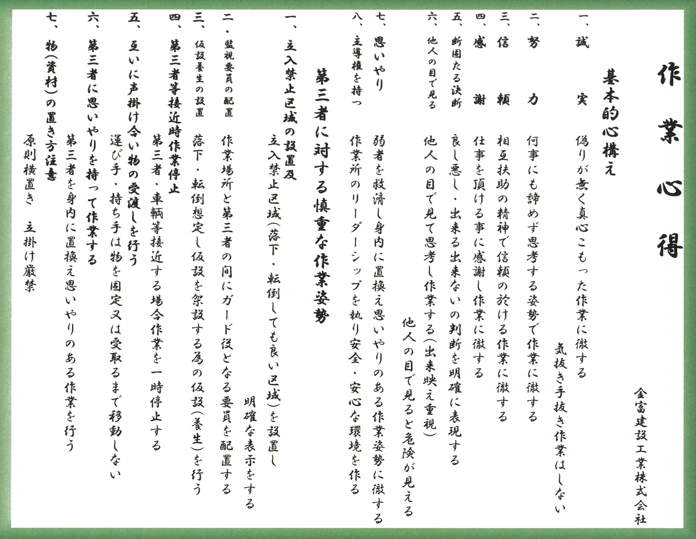 金富建設工業では、年に2回の安全衛生管理徹底大会を開催しております。現場での安全管理についての見直し、改善を行ない、常に安心・安全の環境を維持できるよう努めます。